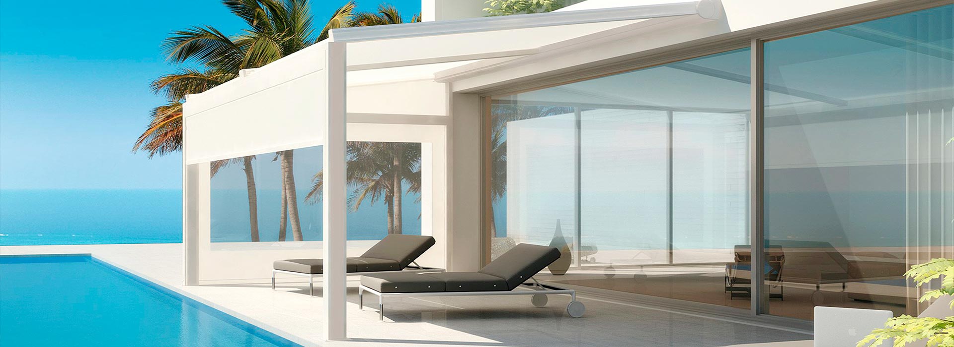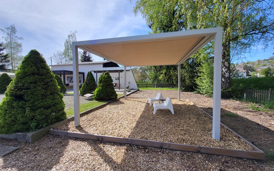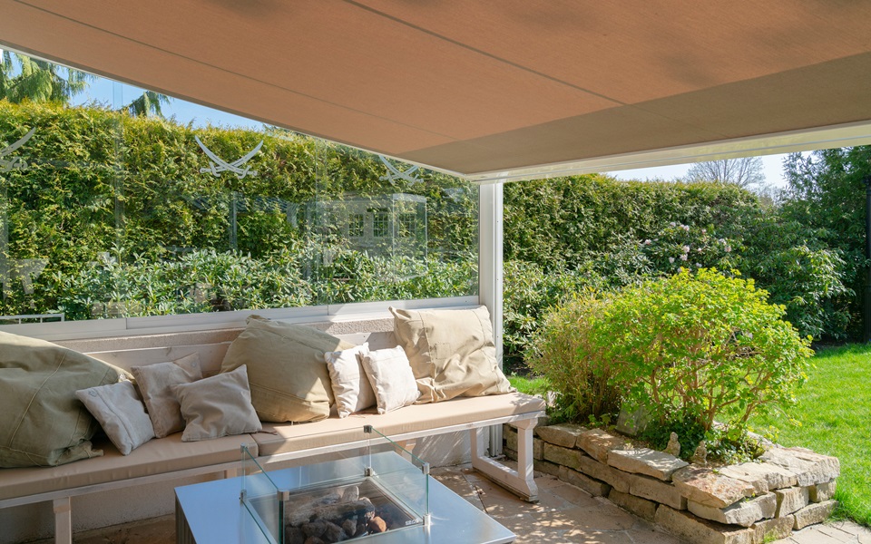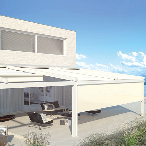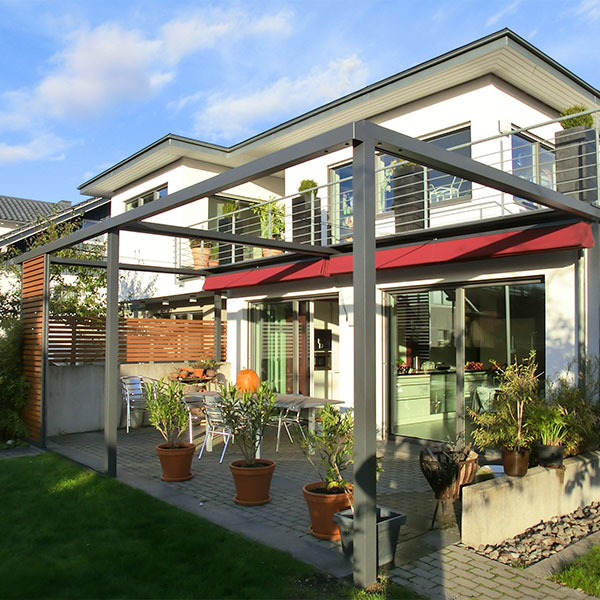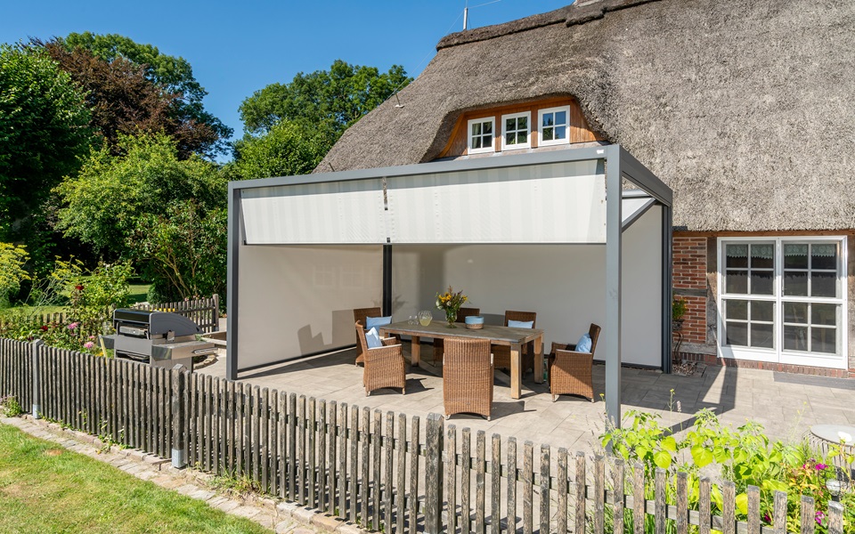 Pergola-Markisen sind besonders dann eine ideale Lösung, wenn die Hausfassade nicht für eine klassische Gelenkarm-Markise ausgelegt ist. Das Gewicht verteilt sich auf die Wandhalterung sowie zwei Stützpfosten. So entsteht eine stabile, regendichte Terrassenüberdachung. Sie können die textile Überdachung motorisch ein- und ausfahren und so an die äußerlichen Rahmenbedingungen anpassen: offen, wenn Sie Sonne und Weite genießen möchten, geschlossen, wenn Wind oder Regen aufziehen.